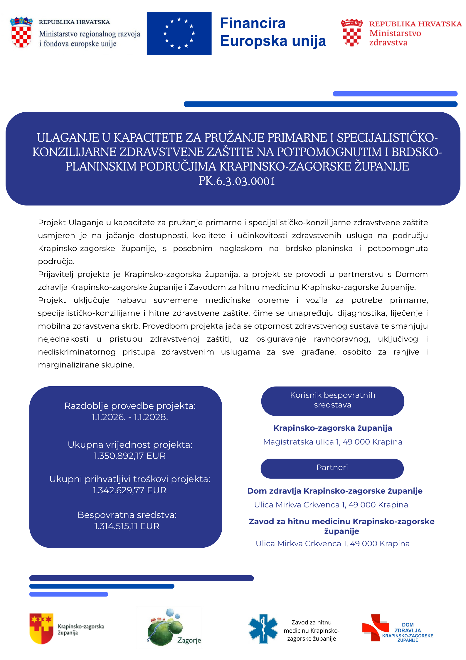 Projekt Ulaganje u kapacitete za pružanje primarne i specijalističko-konzilijarne zdravstvene zaštite usmjeren je na jačanje dostupnosti, kvalitete i učinkovitosti zdravstvenih usluga na području Krapinsko-zagorske županije, s posebnim naglaskom na brdsko-planinska i potpomognuta područja.