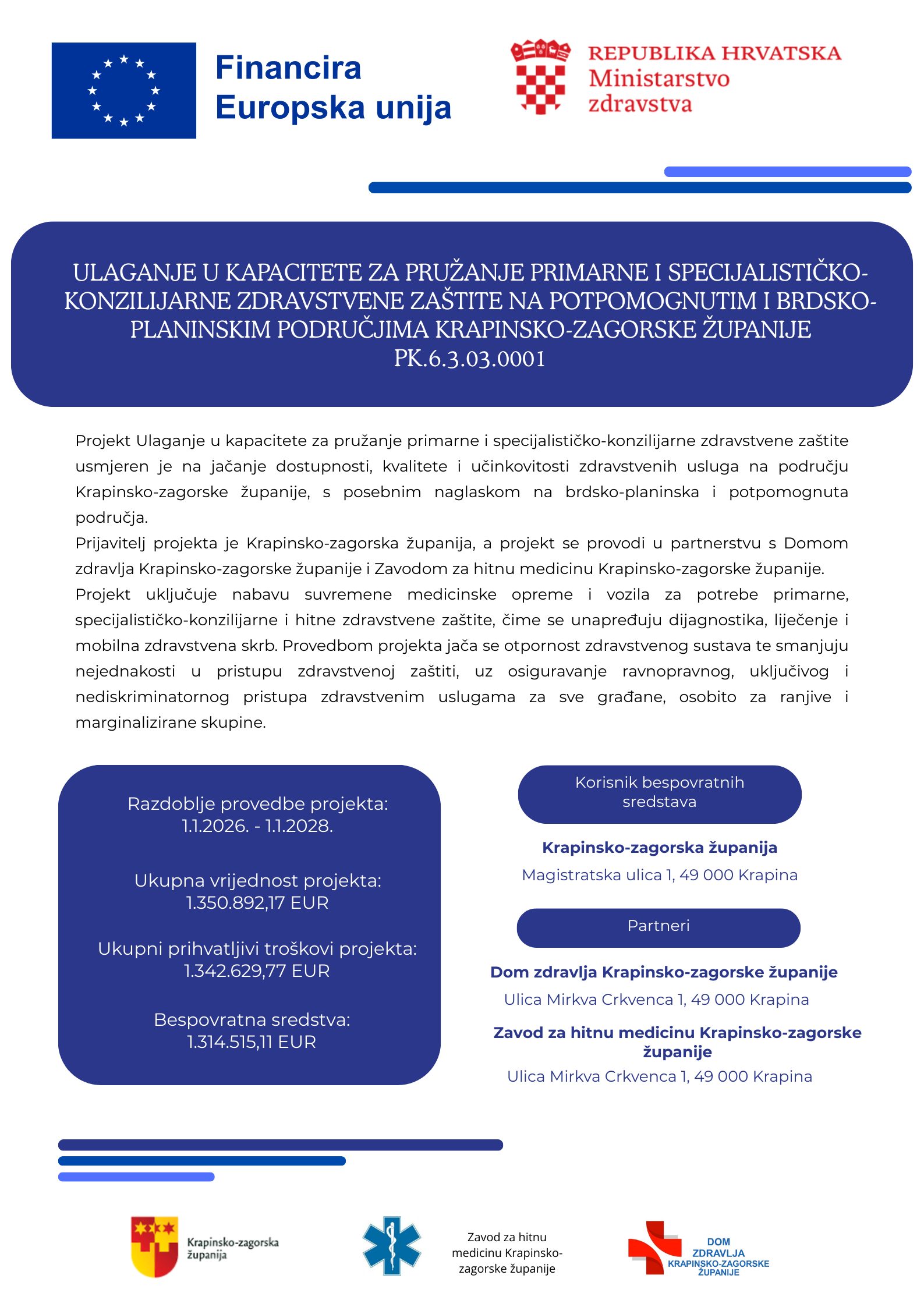 Prijavitelj projekta je Krapinsko-zagorska županija, a projekt se provodi u partnerstvu s Domom zdravlja Krapinsko-zagorske županije i Zavodom za hitnu medicinu Krapinsko-zagorske županije.